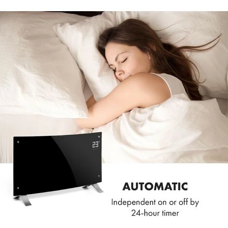 With two heat settings, the 2000 watt Klarstein heaterheats your rooms up to 45 ° C. The desired temperature is always maintained via a thermostat. The ECO mode reduces energy consumption to a minimum: this is good for the environment and your wallet. In Timing mode, the convection heater switches on and off to the minute according to the settings made. The glass panel of the Klarstein Bornholm Single Smart is splash-proof and therefore also suitable for use in damp rooms. The curved shape gives the Bornholm Curved Smart a particularly elegant appearance, and at the same time ensures improved heat distribution in the room.