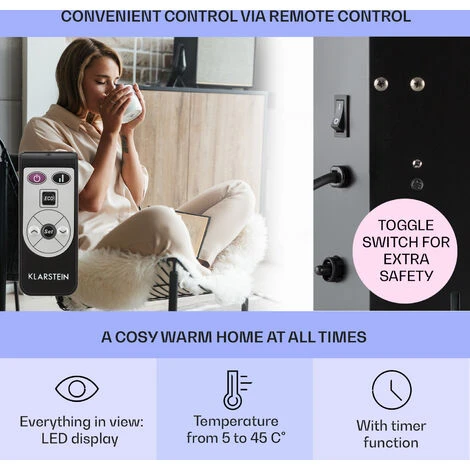 Black elegance creates cuddly feelings and a cozy warmth for slippers and pajama wearers: the Klarstein Bornholm Single convection heater ensures an even temperature increase and distribution of the heated air in rooms up to a size of 25 m2.