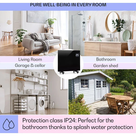 With two power levels, the 1,000 watt strong Klarstein heater warms rooms up to 45°C. Through the device’s thermostat, the desired temperature is maintained precisely. The ECO mode lowers the energy consumption to a minimum; this protects the environment and the wallet. In the timing mode, the convection heater switches on then off according to the settings made and no minute later. The glass panel of the Klarstein Bornholm Single is splash proof and can therefore also be placed in damp areas. Thanks to the rollers on the base, the device can be quickly and easily moved around in the apartment.