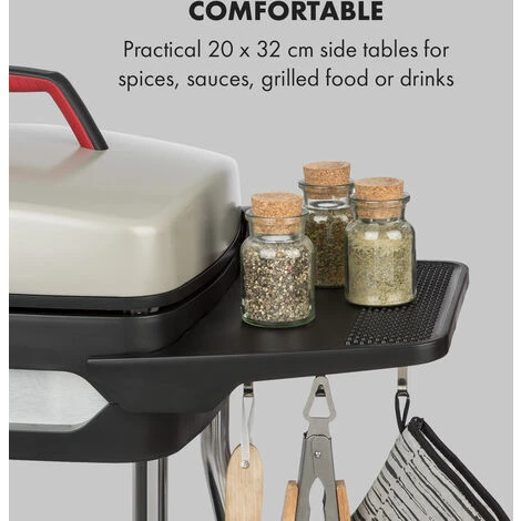 The infinitely adjustable electric grill with 2000 watts heating capacity convinces as a table or stand grill both inside and outside. For outdoor use, the base is simply mounted with four robust stainless steel legs so you can start enjoying the barbecue outdoors right away. So that nothing burns and the Gatsby electric grill is easy to clean, the 40 x 36 cm grill plate made of die-cast aluminium has a high-quality non-stick coating. Leaking fat flows out through the recesses in the grill surface and drips into a tub underneath. To ensure that pulled pork and other BBQ specialties are successful, the Gatsby also features a stainless steel grill hood with a non-stick coating and cool-touch handle. The two practical side tables, each measuring 20 x 32 cm, ensure relaxed grilling. Spices, sauces, grilled food, grill utensils and drinks can easily be stored here. Pot holders, towels or grill tongs can of course also be hung on the three hooks. If this space is not enough, the 55 x 47 cm shelf in the base helps by providing space for more drinks or more food. Thanks to its two wheels, the grill can also be moved very easily.