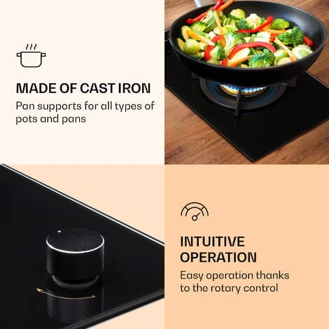 All fire and flame for you: The Klarstein Goldflame gas hob convinces with a high-quality wok burner that heats up your kitchen with an output of 3.4 kW. The triple ring burner distributes heat evenly in the centre and around the edges of your pots and pans. The different flame sizes have a direct effect on the heat output. You can easily adjust it at any time during the cooking process using the smooth rotary control. The 8 mm thick, tempered ceramic glass not only looks incredibly elegant, it is also wonderfully easy to clean.