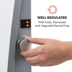 The heater can be easily controlled via a knob directly on the device and exudes heat at heat levels of 600, 900 and 1500 watts. A self-regulating thermostat and built-in temperature fuse reliably ensure a constant room temperature as well as energy-saving consumption. A control light also provides information about the existing settings at any time.