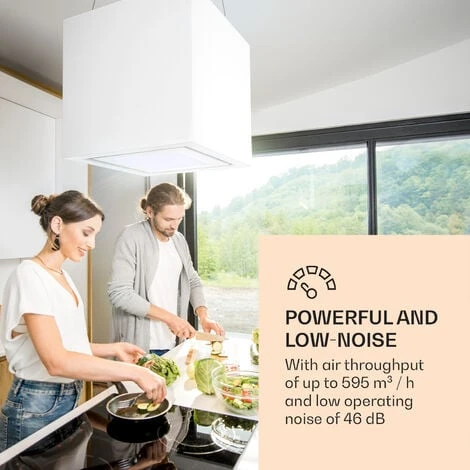 With the Kronleuchter Smart from Klarstein, the name says it all: the smart island extractor hood with an air flow rate of up to 595 m³ / h ensures clean and clear air in the kitchen. The integrated 6500 Kelvin LED panel lights up your cooking as bright as day. The hood can be controlled very conveniently via the Klarstein app. High-quality materials and the cubic design combine to create a real visual highlight. With three power levels, a low operating noise of 67 dB and energy efficiency class A, the Klarstein Kronleuchter Smart is truly impressive.