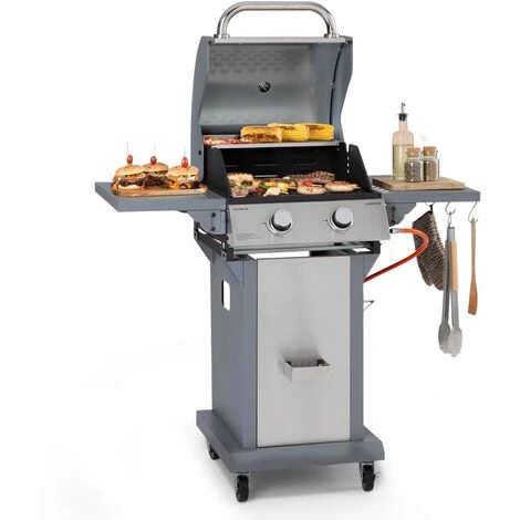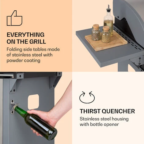 Light it, grill it, delicious! The Klarstein Lucifer 2 gas grill with 2 burners ensures cosy barbecue evenings in convivial company. At the same time, it radiates a modern, warm charm with its clear design, the grill plate and the foldable side tables made of stainless steel.