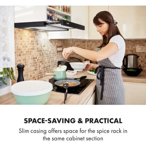 Versatile, powerful and incredibly compact: the Klarstein Mariana 60 flat screen hood with a smart pull-out mechanism ensures a haze-free kitchen at all times.