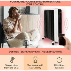 Thanks to a 24-hour timer for switching on and off, you can sleep peacefully and relax while the oil radiator is still in operation: it switches itself off reliably after the selected time. The low weight and 4 floor rollers, which allow you to easily change the location of the heater, ensure mobile use. Operation can also be carried out using the supplied remote control without having to get up.