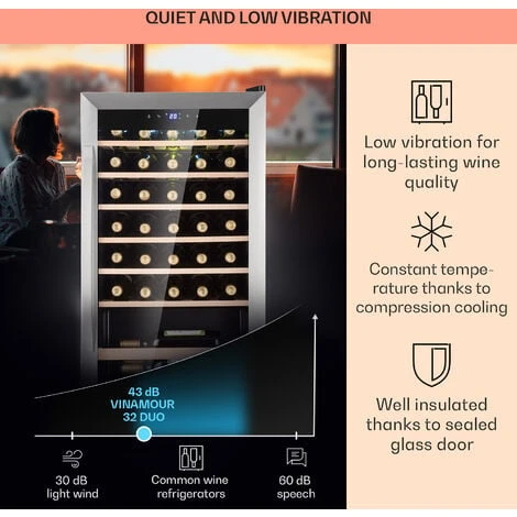 The Klarstein Vinamour 32 Uno wine refrigerator ensures the best wine enjoyment. With one cooling zone, it gives a total of 36 bottles of red or white wine the right drinking temperature. Cooling temperatures from 4 to 18 °C can be set via the touch control panel & are also ideal for sparkling champagne. It provides a luxurious ambience and presents the fine wines in a special way. The white lighting puts an elegant focus on the wines stored inside, and you can enjoy a perfect view of everything through the panoramic glass door.