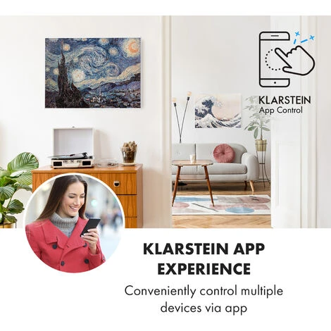 The Klarstein Wonderwall Air Art Smart infrared heater combines highly efficient heating power with attractive design and the latest technology. The 80 x 60 cm heating panel can be hung directly on the wall, is only 5 cm high and hardly bigger than a framed picture. With its powerful 500 Watt output and owing to IR ComfortHeat it spreads very pleasant heat for the human skin without getting lost in the air. Thanks to infrared technology, the heating panel is extremely energy-efficient and environmentally friendly, as a full 98 % of the power is converted into radiant heat. Smart functions for control via app, thermostat, auto switch-off function and IP44 protection class skilfully round off the innovation.